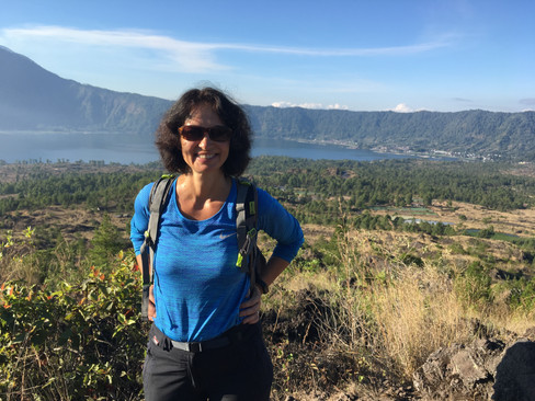 Wir klettern 2 Stunden auf den Vulkan. Es ist stockfinster und die junge Studentin spornt uns zu Höchstleistungen an, weil sie für uns einen besonderen Platz für den Sonnenaufgang zu ergattern versucht. Ein Tatzelwurm von Stirnlampen kämpft sich den Berg hoch. Es hat sich gelohnt, wir erleben den schönsten Sonnenaufgang unseres Lebens. Logisch es ist ja auch der erste von Tamara. Keine Wolken, Nebelschwaden im Tal und der qualmende Vulkan Agun im Hintergrund. Atemberaubend.
