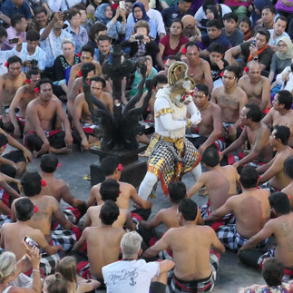 Jetzt zum Höhepunkt des Tages Pura Lubur. Es ist Wochenende und es sind tausende von Touristen dort und wir laufen dem Küstenweg nach Norden und Süden und suchen den Tempel, die Restaurants und die Tänze bei Sonnenuntergang. Mit knurrendem Magen fragt Tamara einen Tourguide, wo der Tempel ist und wann die Tänze beginnen. Eigentlich interessieren uns nur die Restaurants. Er zeigt uns den Stecknadelgrossen Tempel in der Ferne. Er steht dort wo der Indische Ozean und der Pazifik sich treffen. Er wollte soeben Tickets kaufen gehen für seine 4 "Bule", so werden die weissen Touristen genannt. Er fragt uns, ob er für uns auch gleich Tickets kaufen soll, wir könnten hier warten und die Aussicht geniessen, Wir geben ihm 200‘000 und hoffen das es klappt. Nach ca. 20 Minuten hat er sich die Tickets erkämpft und wir nehmen in der Tanzarena mit Sicht auf den Tempel bei Sonnenuntergang platz. Eine atemberaubende Kulisse und Spektakel mit Gesängen und Theater. Die Spannung steigt und der Hunger auch. Immer noch aufgeregt von den Eindrücken gehen wir endlich essen und schlussendlich schlafen in unserem Deluxezimmer. Nach einer erholsamen Nacht und dem leckeren Reis-Bananenpancake gehen wir an den Strand. Die Dreambeach ist von Hotels umzäunt und von Touristen aus aller Welt übersäht. Wir laufen 5 Minuten und liegen alleine an einem einsamen Strand. Eine verlassene und angesprayte Hotelanlage auf Holzpfeilern.