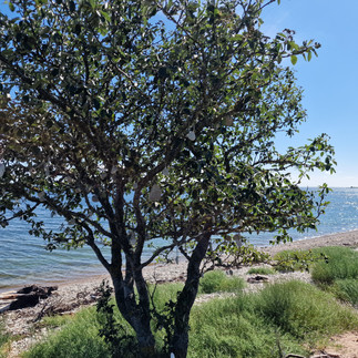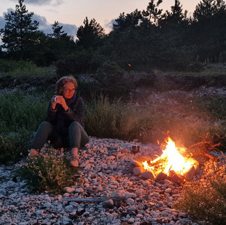 Weil es erst um 23 Uhr dunkel wird fragen wir uns wo wir heute schlafen wollen und biegen spontan rechts in die Büsche ab und finden den perfekten Schlafplatz. 3 Meter vom Meer unter dem Baum der durchbohrten Steine - der Baum ist wie ein Weihnachtsbaum behangen mit durchbohrten Steinen, welche am Strand herumliegen. Einfach ein Geschenk! Nun geht es ans Holz suchen. Was ist ein Traumstrand ohne Feuer? Wir sitzen am Strand mit einer Tasse Tee und einem lodernden Feuer. Der Leuchtturm begleitet uns bis in den Schlaf, weil er uns durch das Schlafzimmerfenster alle 10-12 sec zublinzelt. Es ist schön hier zu sein. Dankbar schlafen wir ein.