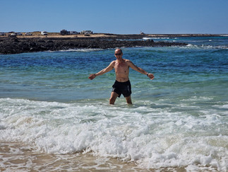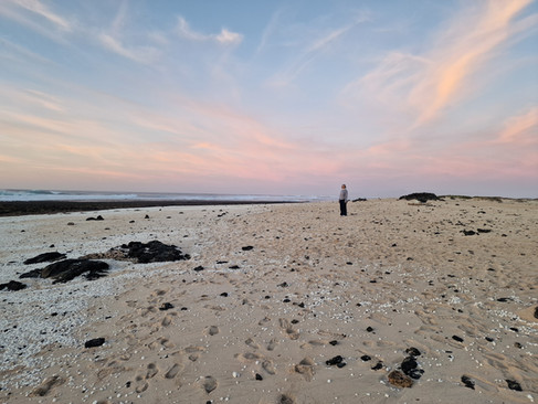 Tamara und ich wollen uns noch gebührend vom Strand verabschieden und nochmals das Meer von Fuerteventura fühlen. Darum machen wir einen keinen Spaziergang am Strand.