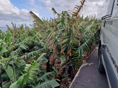 Durch die Bananenplantagen fahren wir gemächlich. Ich habe noch nie so viele Bananen auf einen Blick gesehen wie hier in La Palma. Viele wären auch in Griffnähe aber so etwas machen wir heute nicht. Wir parken neben einem Bananenfeld. Wo auch sonst?