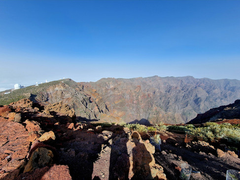 Ein steiler Weg an den äussersten Punkt des Roque de Los Muchachos fordert höchste Selbstüberwindung für Tamara mit der Höhenangst. Die Aussicht lohnt sich jedoch und die besonderen kanarischen Raben sind auch schon dort. Heute ist Calima und darum wirkt alles etwas dunstig, obwohl die Sonne scheint.