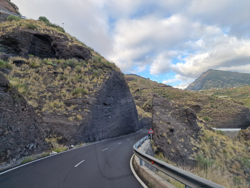 Beim Dorfausgang von Puerto Naos steht die Polizei. Ich habe alles richtig gemacht und sie halten mich an. Er streckt mir eine Plastiktüte entgegen und ich weiss nicht, was das ist. Er sagt auf spanisch «öffnen» und erst jetzt erkenne ich den Aufsatz: Ich muss blasen. Scheinbar habe ich hinter dem Steuer so glücklich ausgesehen, dass der Polizist gedacht hat, der muss doch getrunken haben😊. Mit 0.00 Promille fahren wir weiter. Auf der Fahrt sehen wir, wie die Wolken versuchen über die Caldera zu kommen. Der Wind und die starke Sonne halten sie jedoch ab.