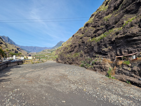 Anschliessend kaufen wir ein und fahren an den Strand nach Playa de Tazacorte. Dieser schwarze Sandstrand liegt am Ende der Caldera Schlucht, welche direkt in den Krater führt.