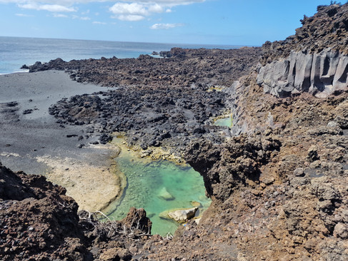 Die Schwimmweiher an den Felsen sehen aus wie Oasen. Das blaue Meer, der schwarze Strand und die farbigen Felsen geben den türkisfarbenen Seen die entsprechende Leuchtstärke. Es sieht gewaltig aus.