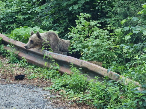 Bekanntlich stirbt die Hoffnung zuletzt und wir sehen einen kleinen dunkeln Bären im Gras neben der Strasse sein Frühstück geniessen. Er knabbert friedlich an den Blümchen und wir sind hin und weg. Es kommt uns in den Sinn, dass 80% der Bären Vegetarier sind. Oder waren es 80% vegetarische Nahrung und 20% Fleisch. Hmmm, wir bleiben natürlich im Auto und schauen dem kleinen Kerl eine Weile zu - bei geschlossenem Fenster...