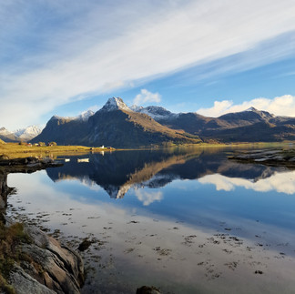 Als erstes besuchen wir Myrland ein kleines Dorf eingebettet in eine Lofoten Bergkette. So idyllisch, dass wir nicht einmal einen Parkplatz finden der nicht «privat» aussieht. Auf dem Rückweg wandern wir am Strand und staunen über die Weite, die Berge und den weissen Sandstrand. Wir kennen die Strecke nun wie unsere Westentasche und wollen heute etwas Neues entdecken. Darum biegen wir kurzentschlossen nach Gravdal Richtung Ballstad ab. Das Städtchen ist sehr hübsch und scheint noch nicht so touristisch zu sein. Dort schlendern wir durchs Dorf und lassen die Eindrücke auf uns einwirken. Heute hat es keinen Wind und keinen Regen und die Stimmung ist sehr beruhigend. Leider sind schon alle Restaurants und Kaffees ab Oktober geschlossen.